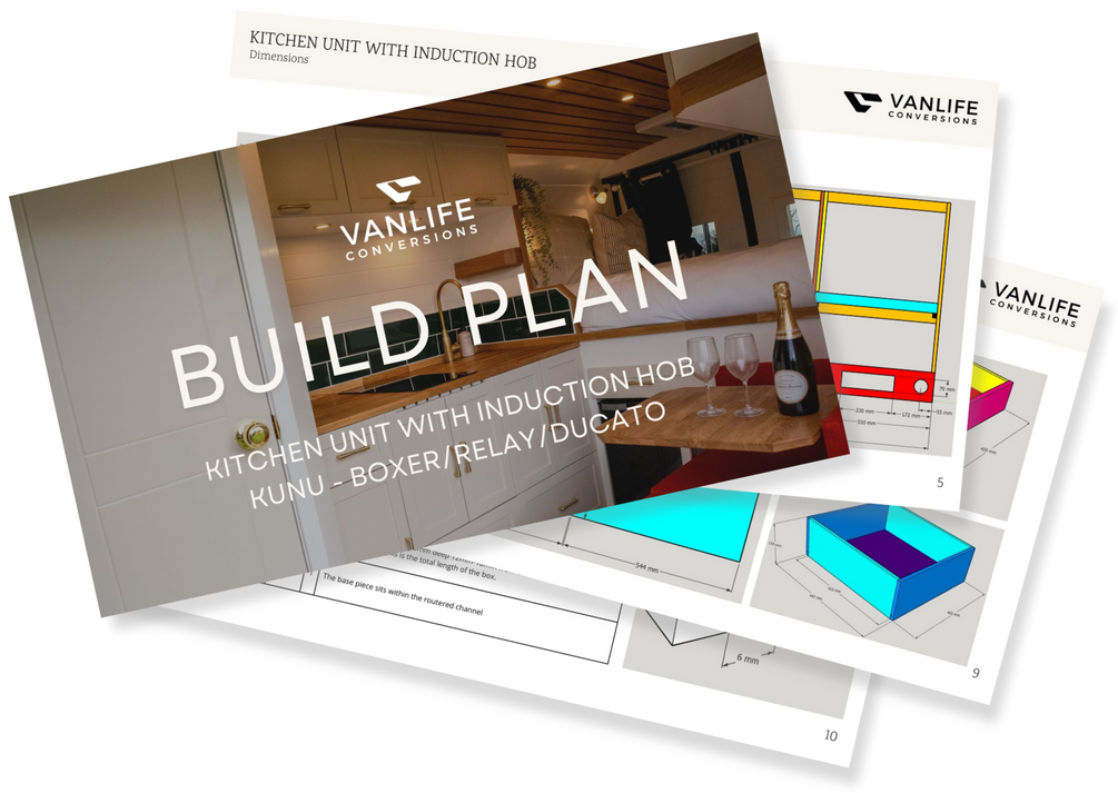 This is a schematic including dimensions and a cut list of how we build our kitchen unit with an induction hob. It is not a step-by-step guide. These plans are for the Kunu layout based on a Fiat Ducato, Citroen Relay or Peugeot Boxer L3H2. They may need to be amended slightly to fit other van models and sizes.