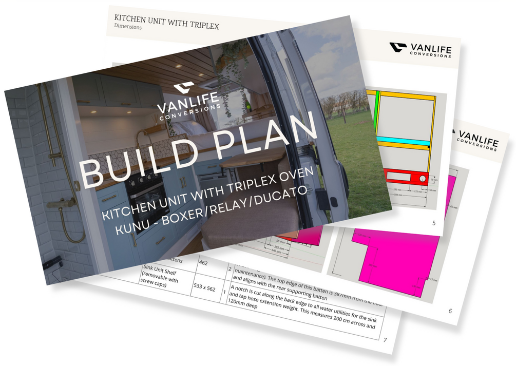 This schematic includes dimensions and a cut list of how we build our kitchen unit with Triplex oven/hob. It is not a step-by-step guide. These plans are for the Kunu layout based on a Fiat Ducato, Citroen Relay or Peugeot Boxer L3H2. They may need to be amended slightly to fit other van models and sizes.